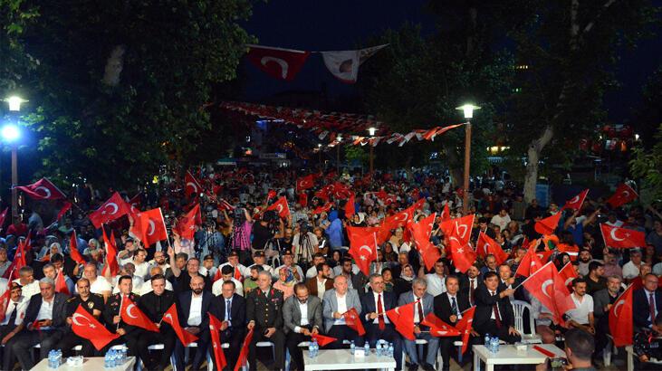 “15 Temmuz’u birlikte yaşadık. Akşam hava kararmaya başladığında biz zannettik yine her zamanki aynı karanlığı yaşayacağız ama simsiyah zifiri bir karanlıkla buluşacağımızı bilmiyorduk. Öyle her köşede bekleyen, dişine kan değmiş sırtlanlar olduğunu, o gece ortaya çıkacağını bilmiyorduk. O sırtlanların parçalayacağı insanların kanlarını emecek akbabaların olduğunu bilmiyorduk o gece başlamadan önce. Ama onlar da unu bilmiyorlardı. Allah’ın aslanlarının, bu kahraman milletin öyle gündüz evine yemek götürme telaşı içinde, çocuklarının geçimini temin etme telaşı içinde olanların o gece bir anda cesaretleriyle ölümün ağzına girecek kadar cesaretli, Allah’ın aslanları olacaklarını da onlar bilmiyorlardı. Bunu ne zaman anladılar? Sabaha karşı anladılar. Sabaha karşı bu milletin devletine, hükümetine nasıl sahip çıktığını biz bu meydanda şahit olduk.”